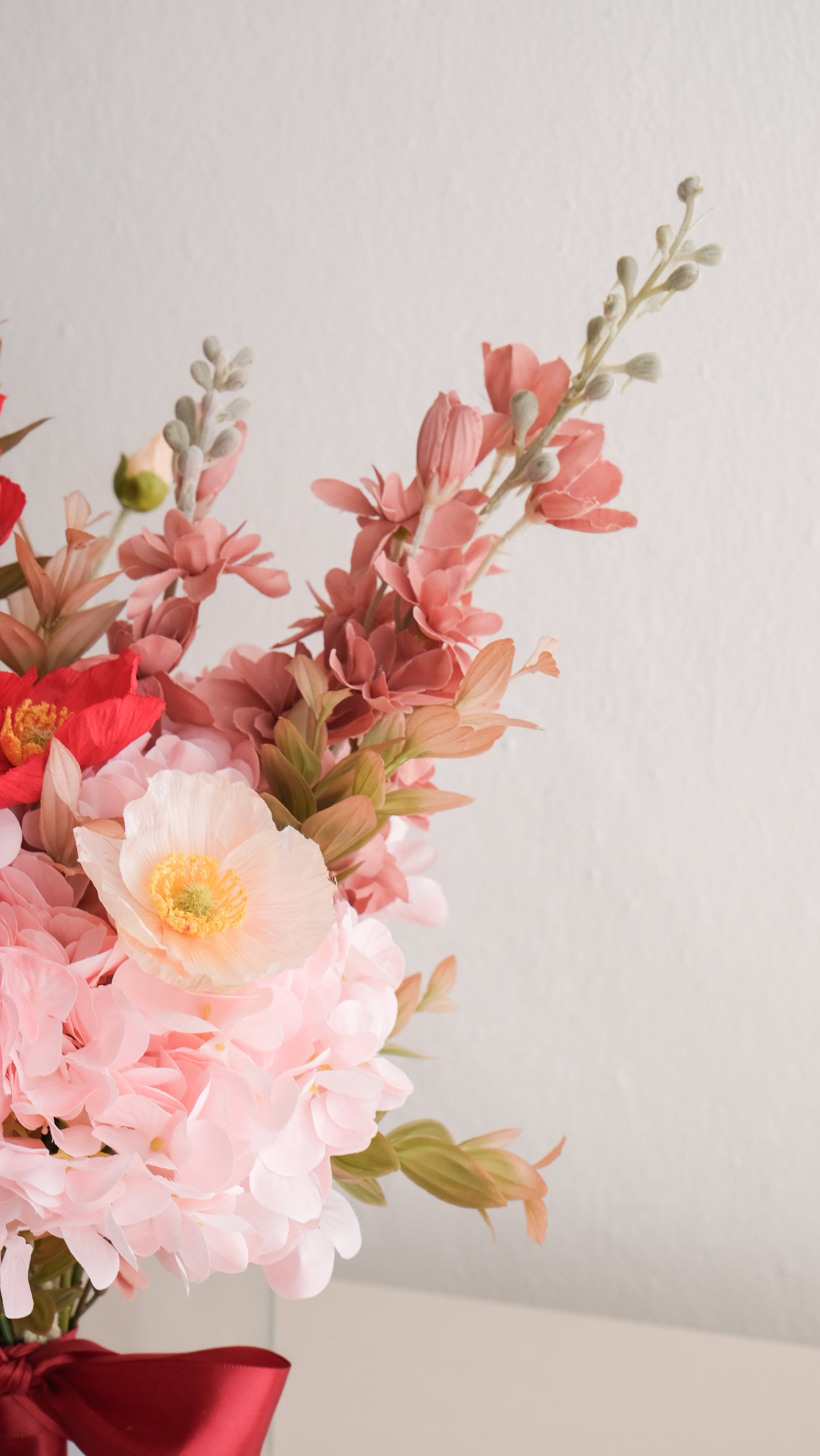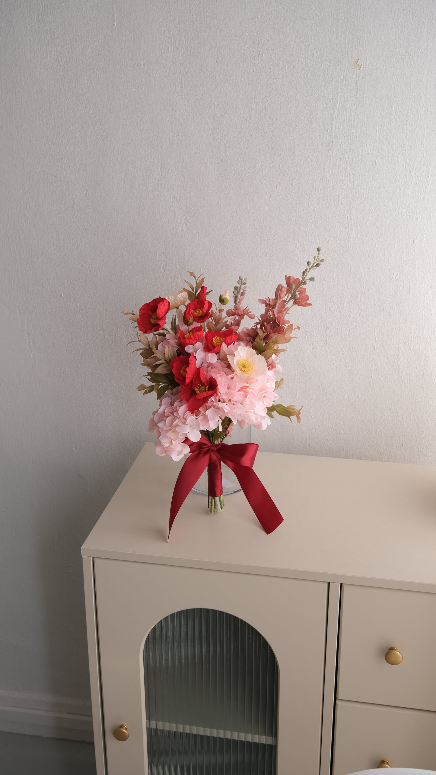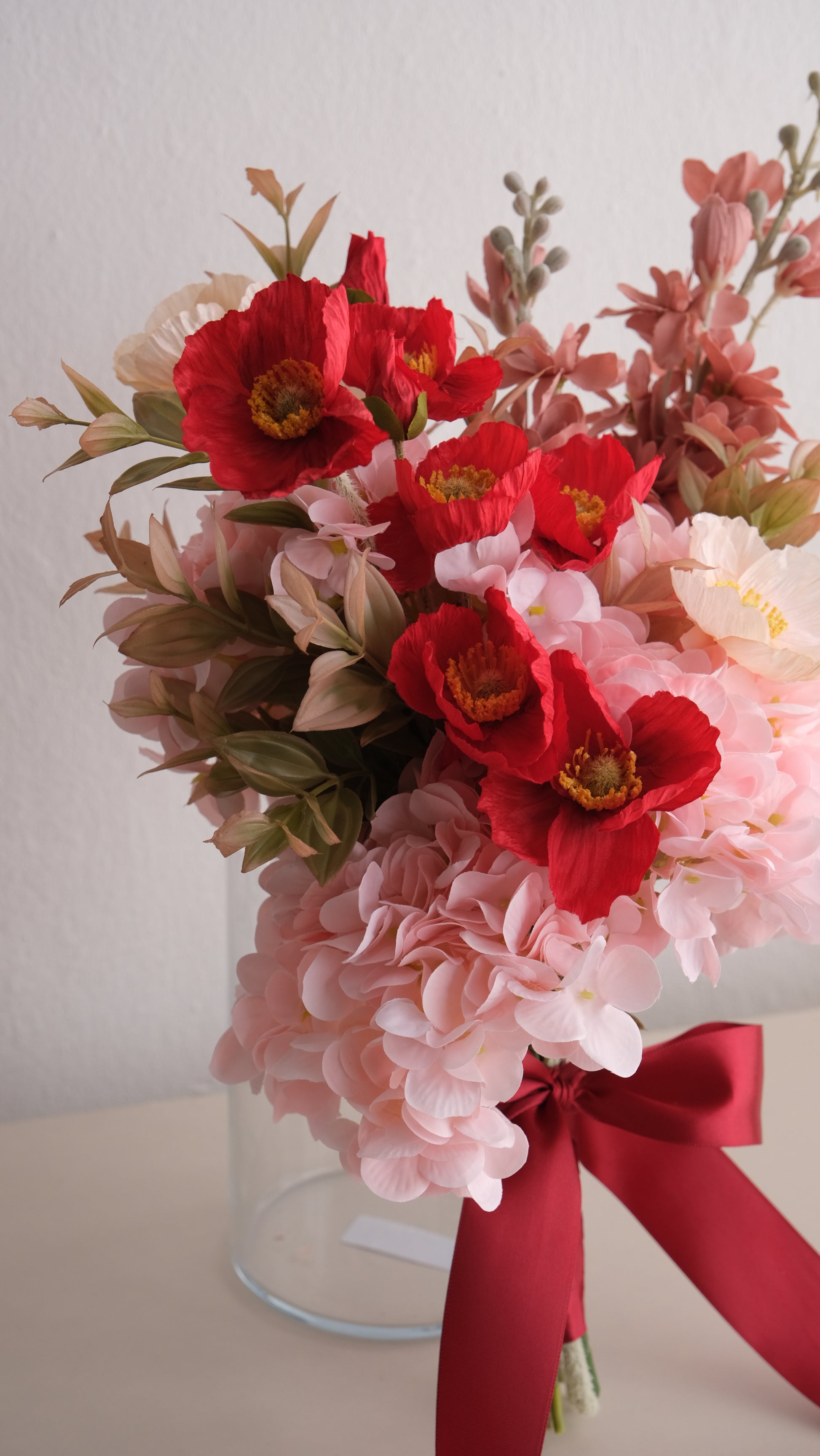 Celebrate your special day with our hand-tied luxurious faux floral wedding bouquet, elegantly adorned with a rich red satin ribbon. This exquisite bouquet features a beautiful combination of vibrant red poppies, soft pink hydrangeas, and lush greenery, meticulously arranged by hand to create a lifelike and sophisticated display. Perfect for brides and bridesmaids, this bouquet adds a touch of timeless elegance to your wedding.