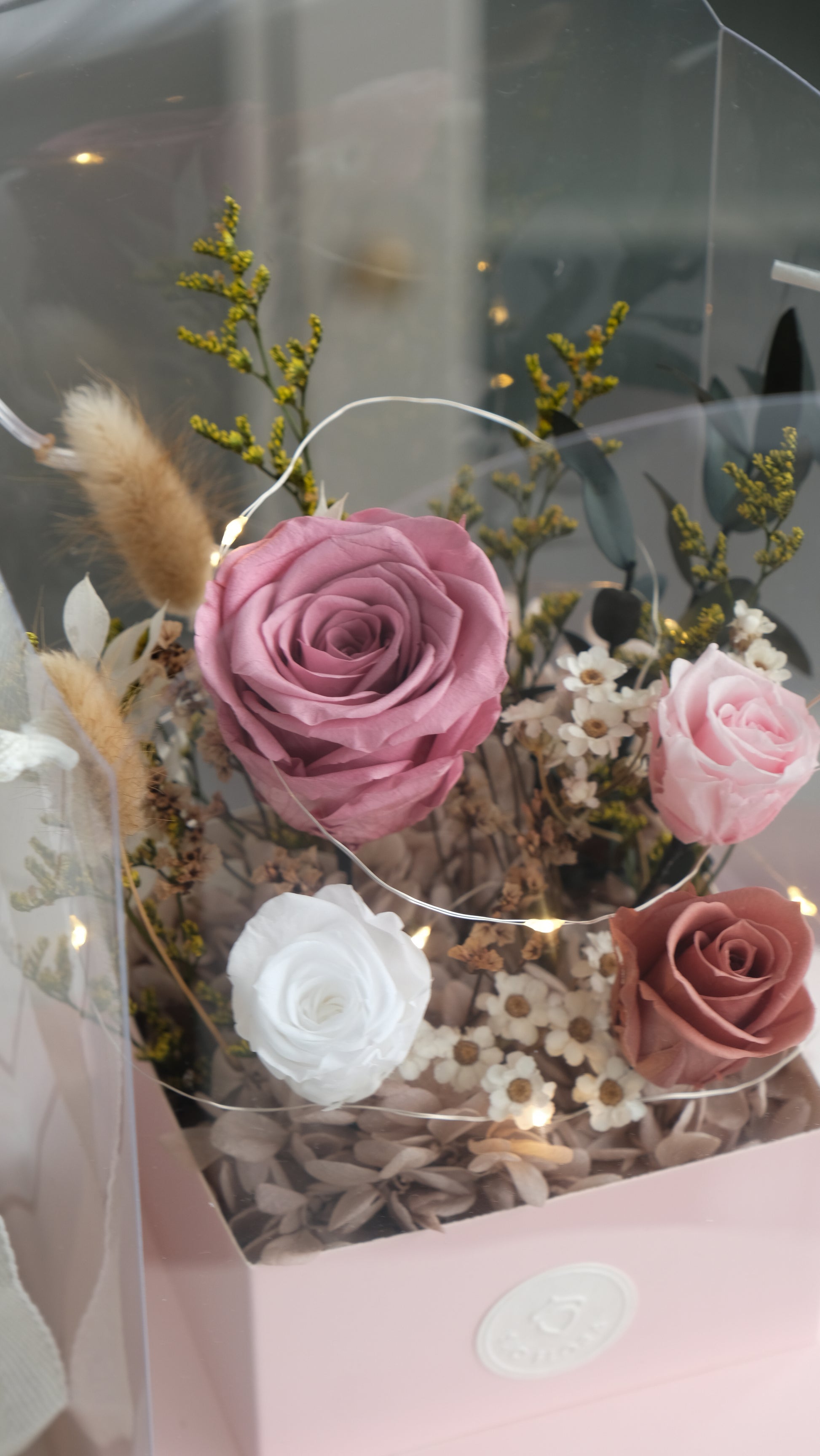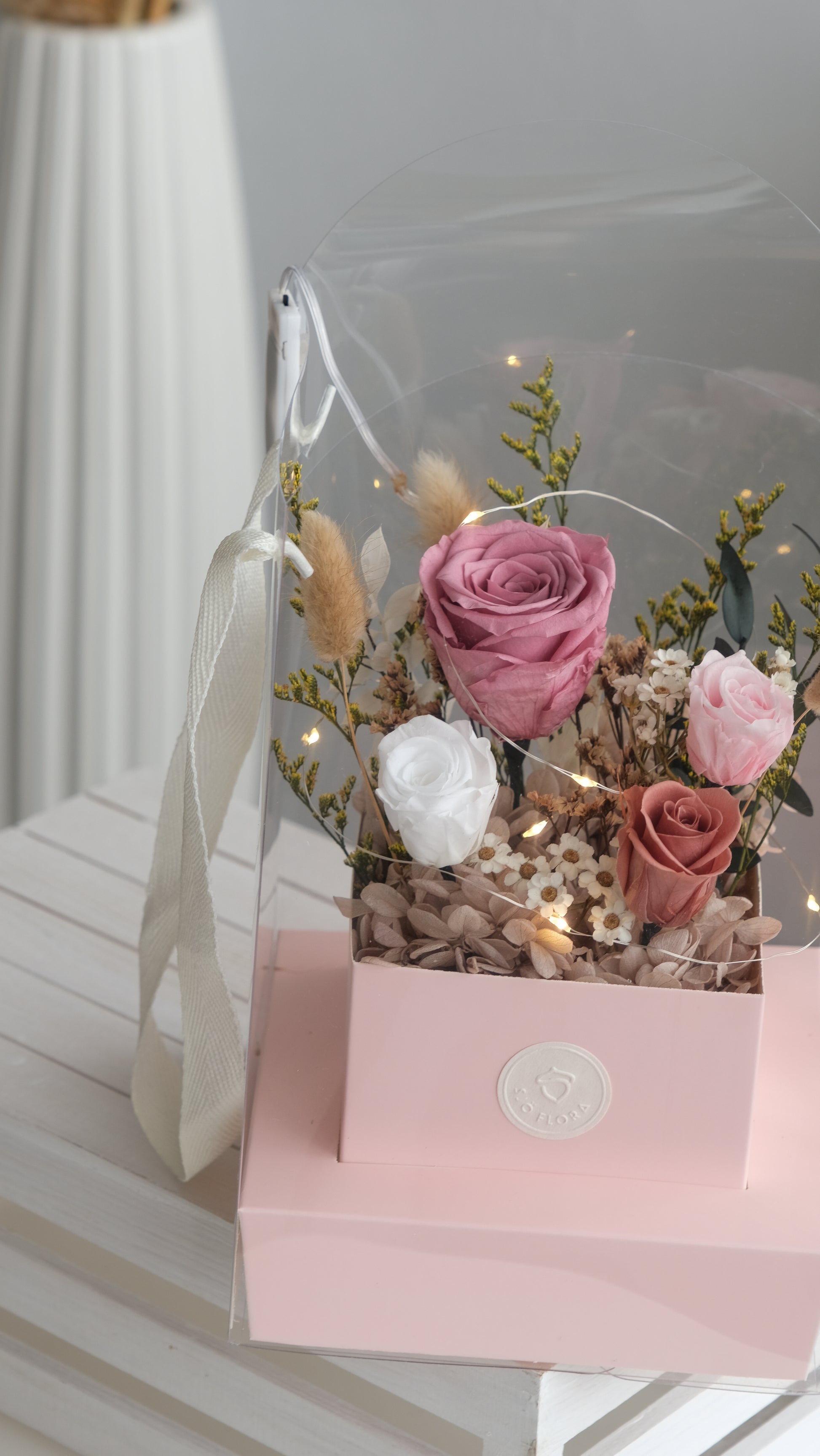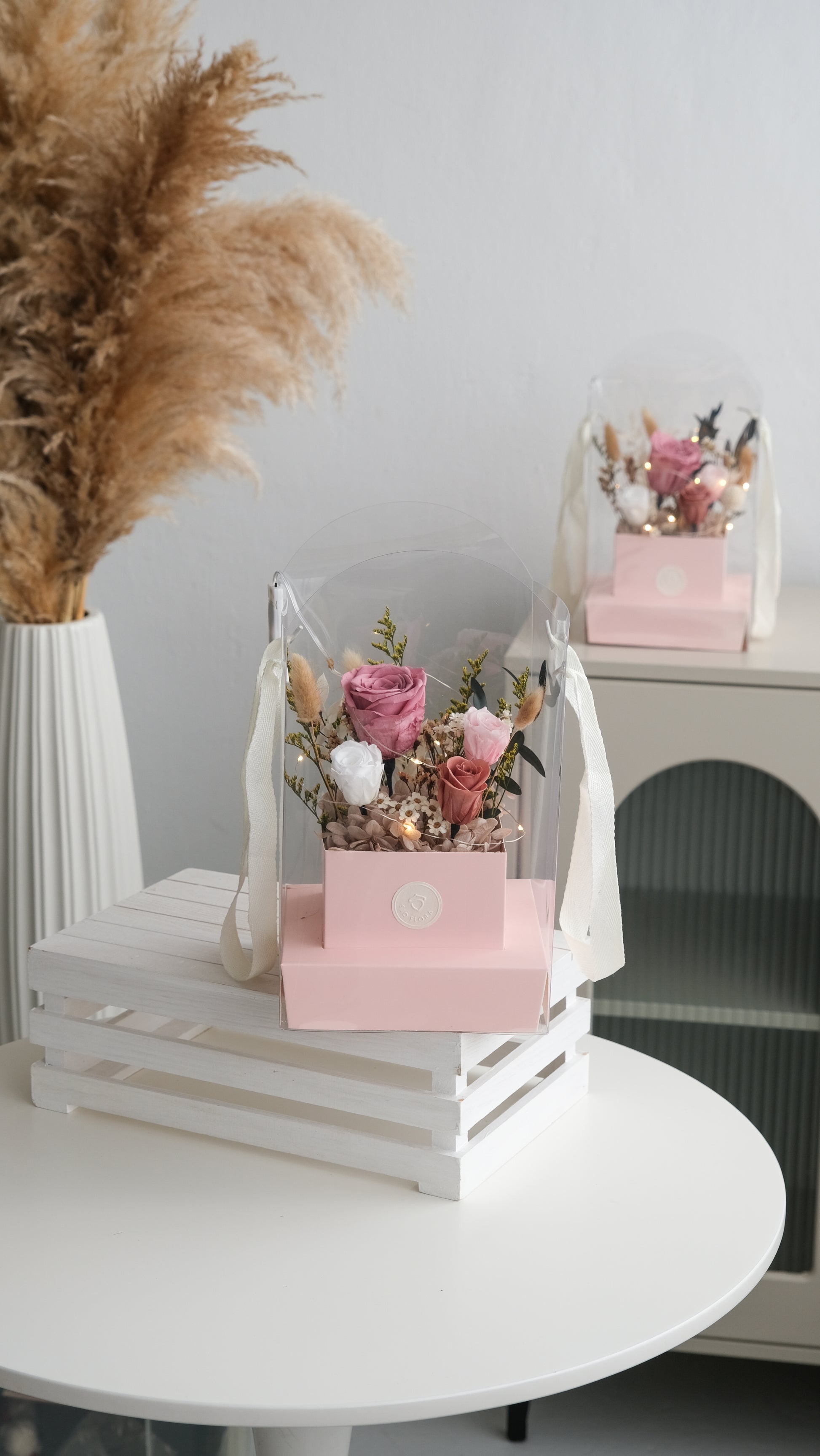 Delight in the timeless beauty of our Preserved Flower Arrangement, elegantly presented in a charming pink gift box with LED. This exquisite arrangement features a delicate blend of pastel-coloured roses, hydrangeas, and other preserved blooms, all artfully arranged to create a stunning and long-lasting display. The flowers are nestled in a transparent cover with a graceful ribbon handle, making it a perfect gift for any occasion. Whether for a birthday, anniversary, or simply to brighten someone's day, this floral arrangement is sure to leave a lasting impression.