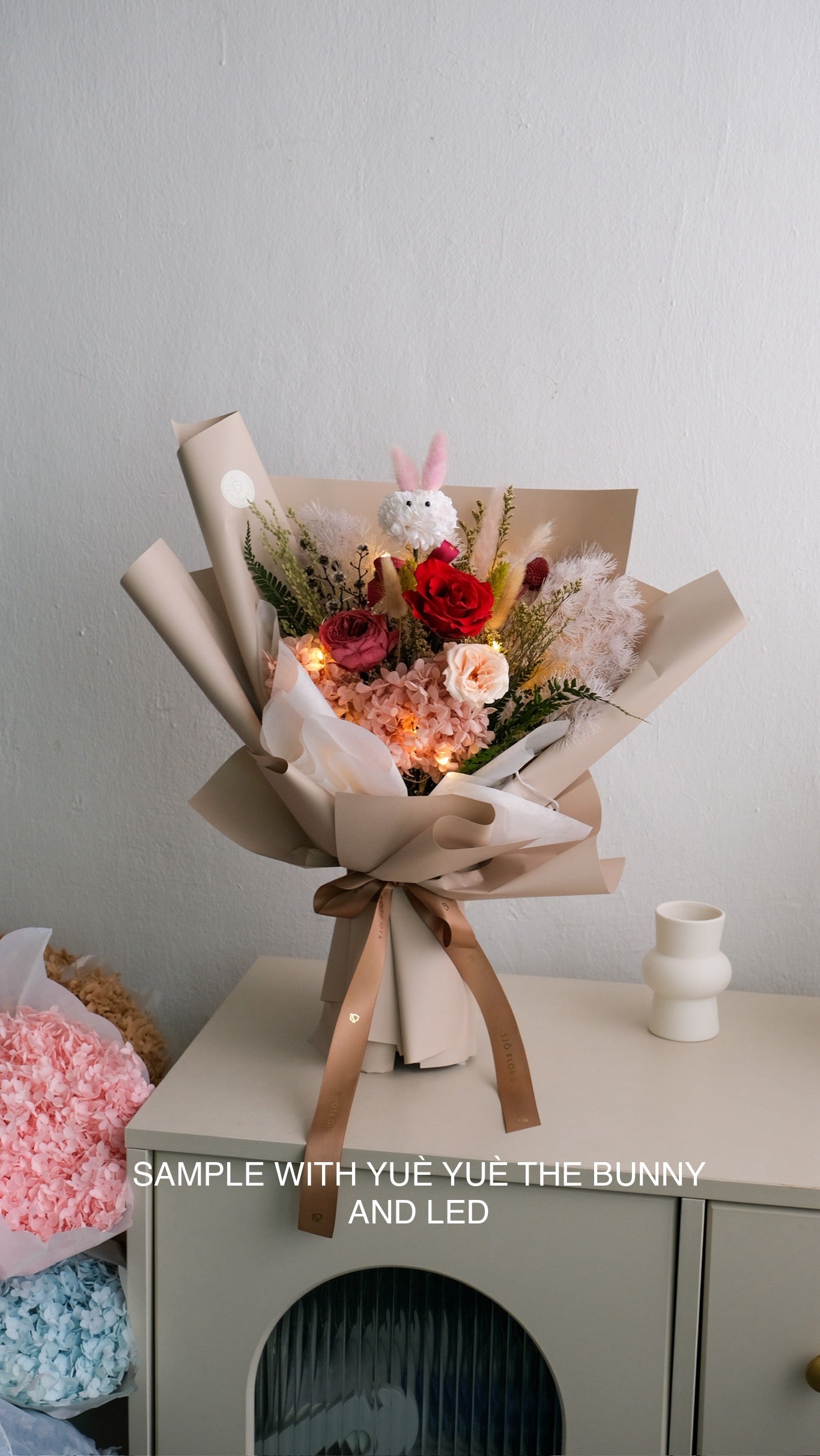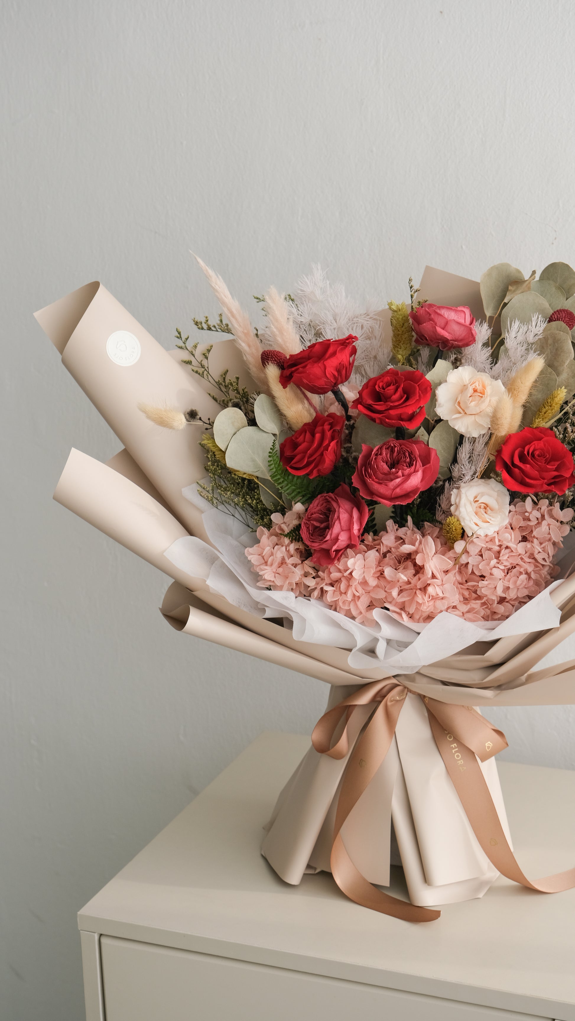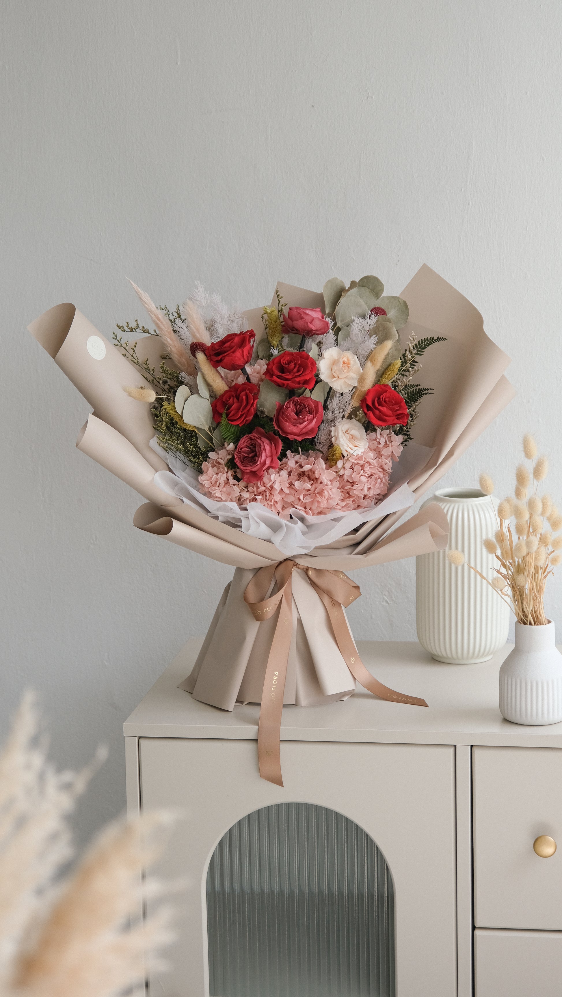 Measuring approximately (L) 50 x (H) 60cm, this floral masterpiece is a testament to the beauty of premium, everlasting blooms crafted with Japan's finest preserved materials. Let the captivating charm of these preserved roses convey your heartfelt emotions, leaving a lasting impression on your loved one. Elevate your gesture with the exquisite touch of Japan's premium preserved roses in this truly mesmerizing bouquet.