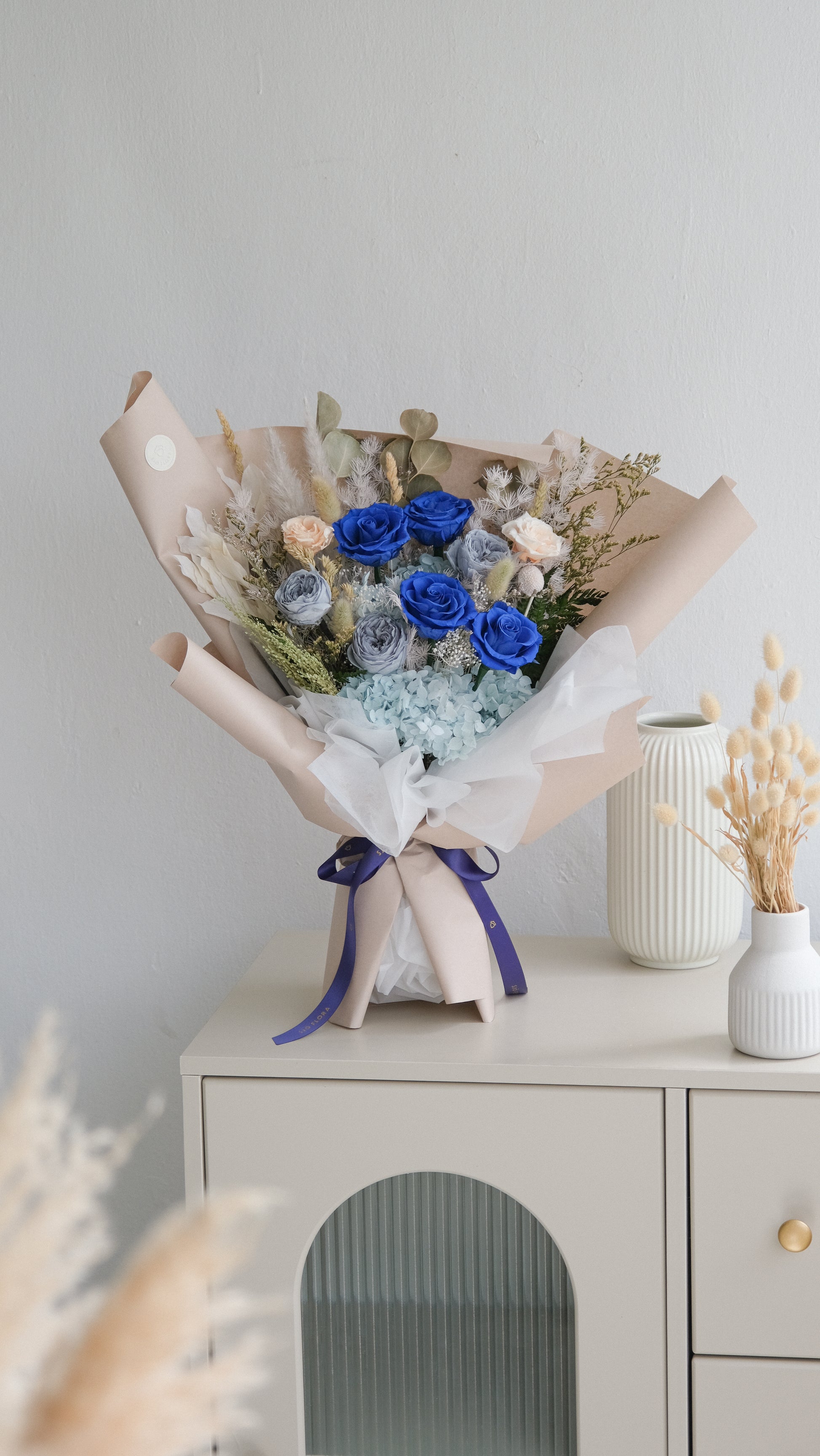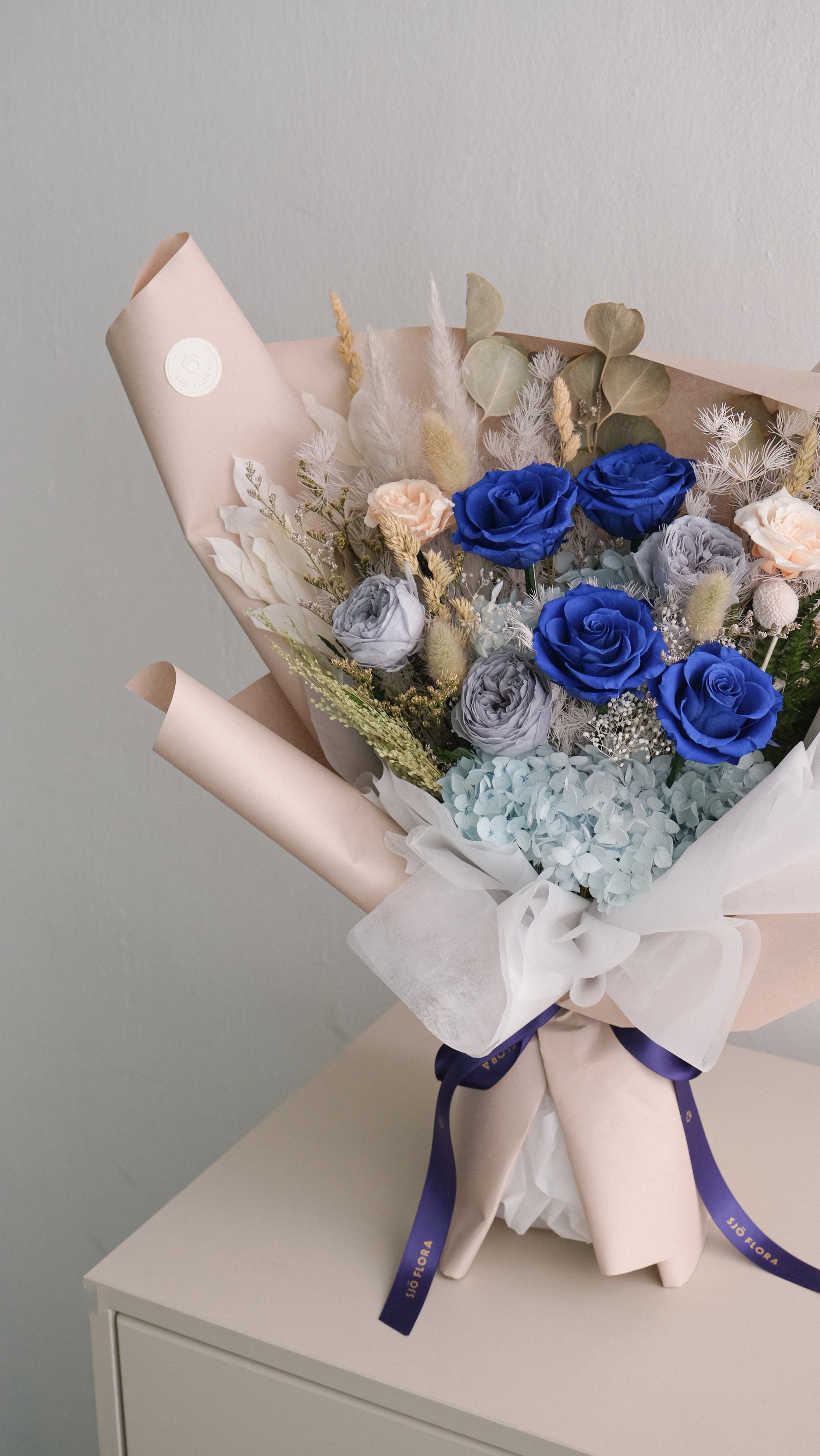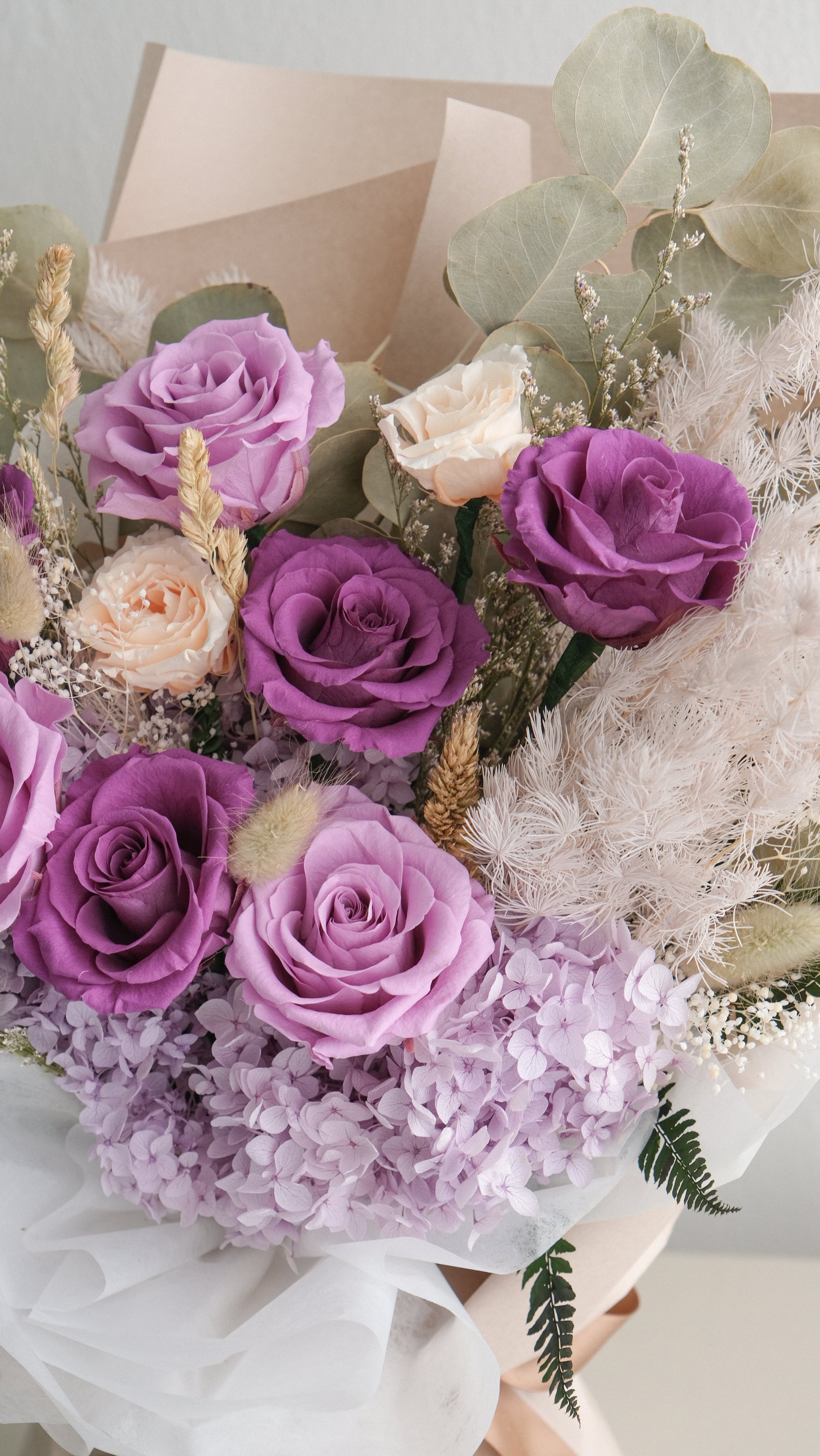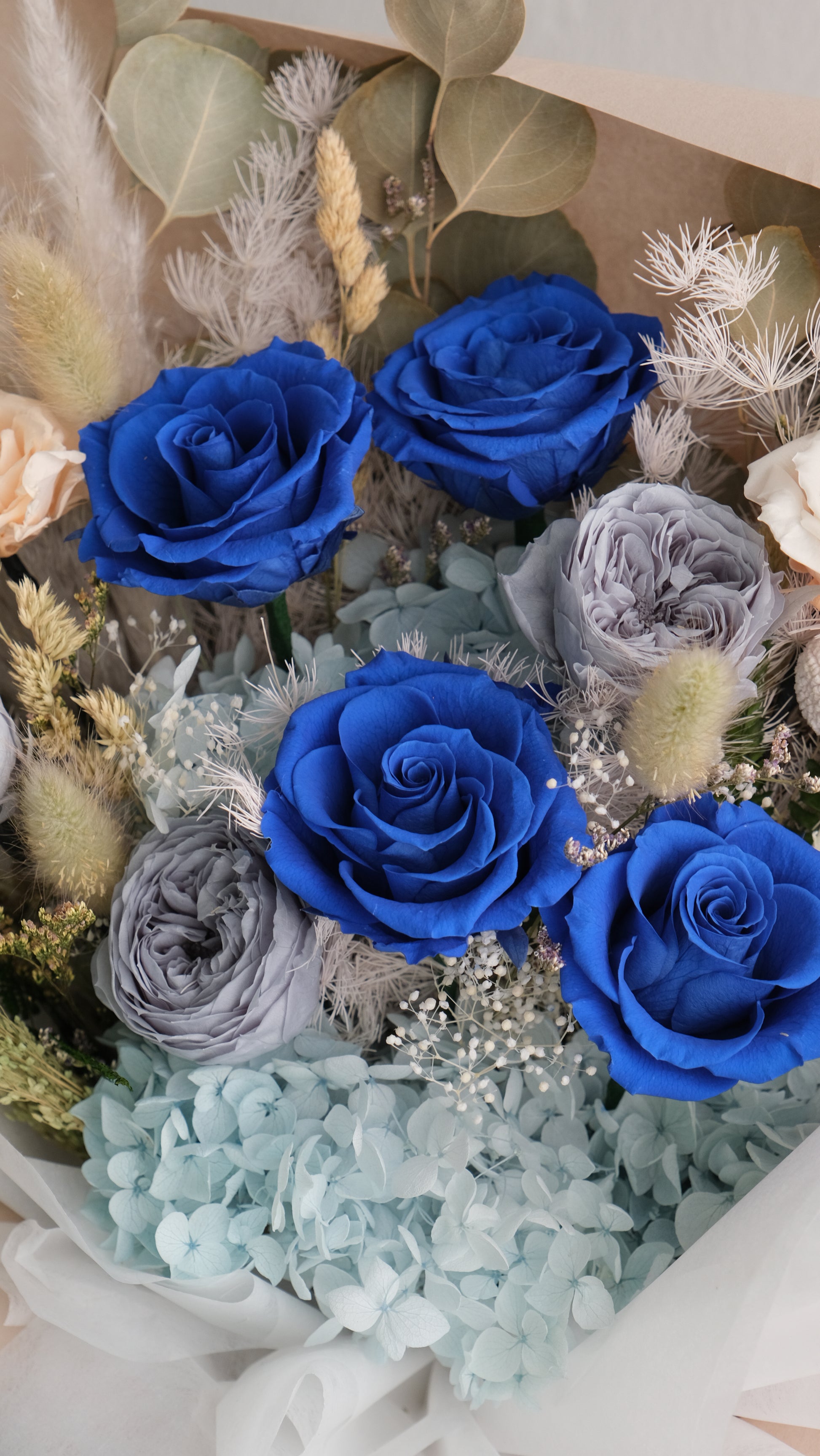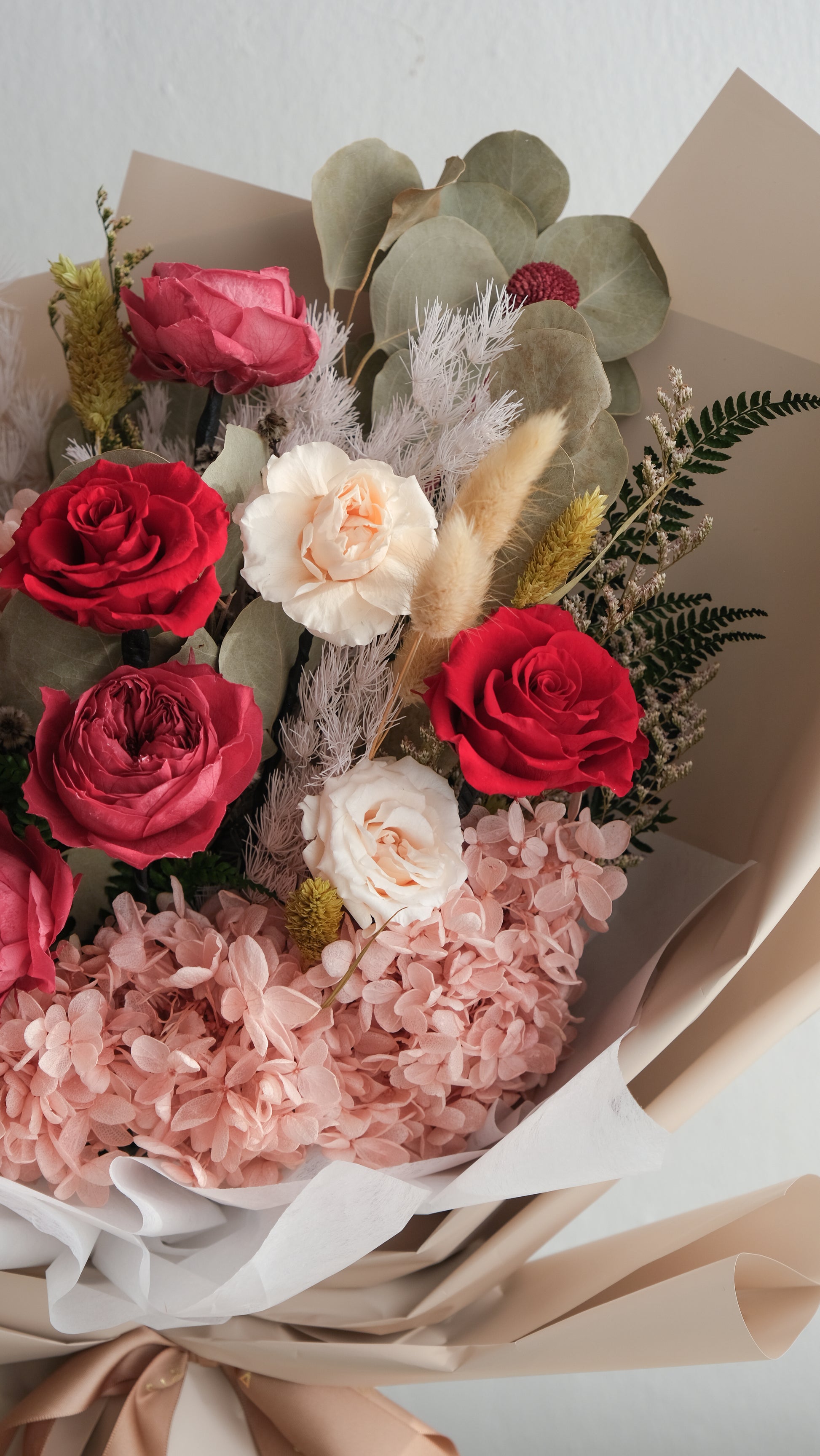 This captivating arrangement features a harmonious blend of stunning colours, including Red, Pink, Blue, and Purple. The bouquet is artfully designed and meticulously arranged with preserved Roses, Majolica Rose, and Temari Rose, beautifully complemented by preserved hydrangeas, Caspia, Lagurus, Fern, Stirlingia, Star Grass, Tail Reed, and delicate Baby's Breath.