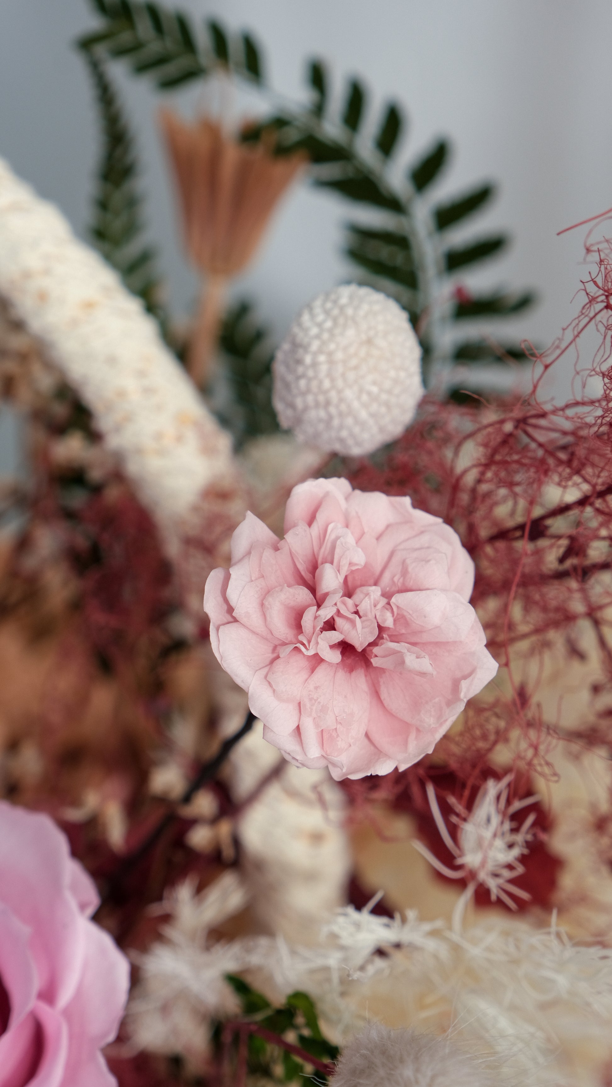 Mainly consists of preserved roses, carnation, preserved hydrangea, dried flowers, bunny tail, preserved and dried fillers.