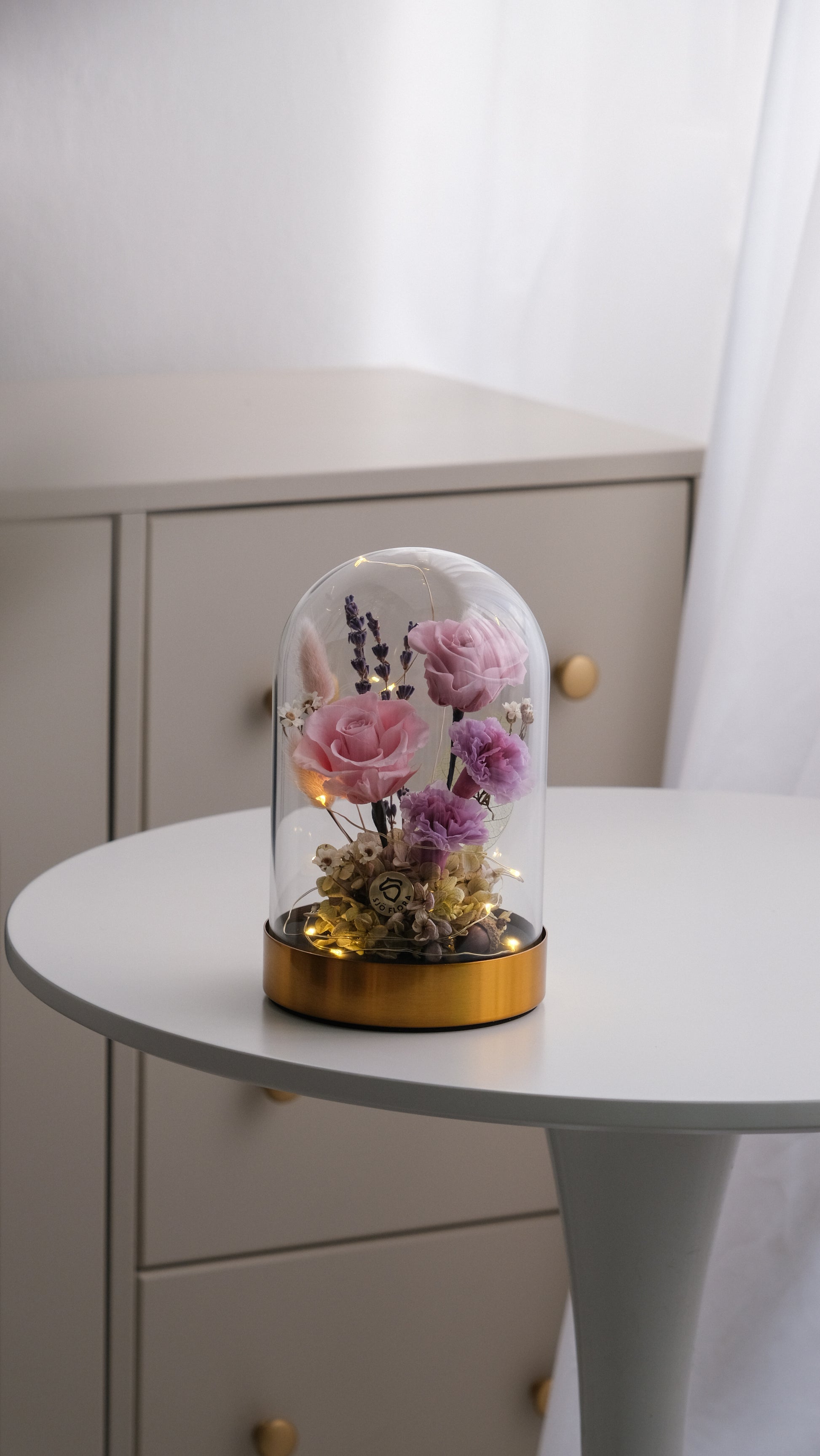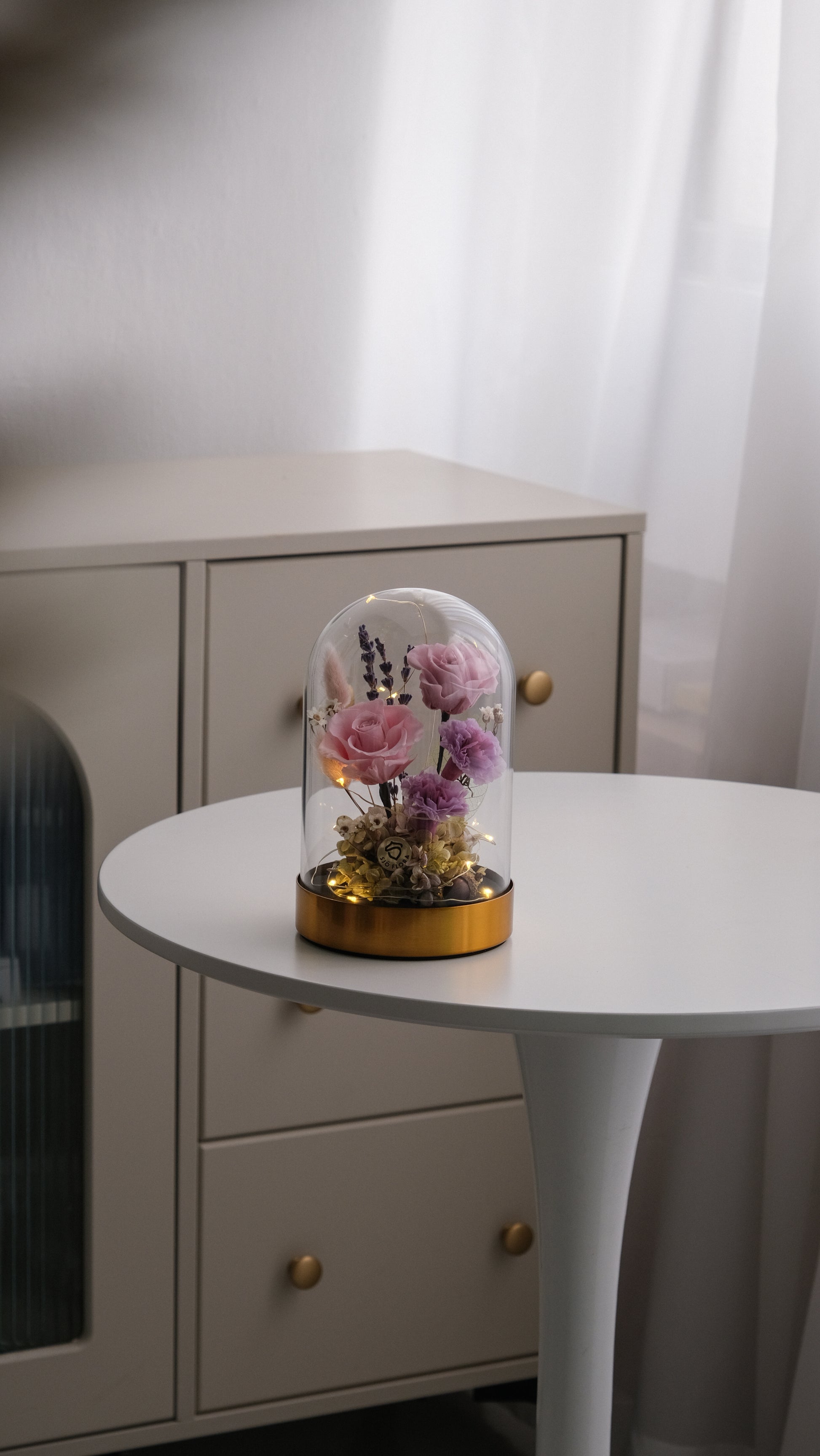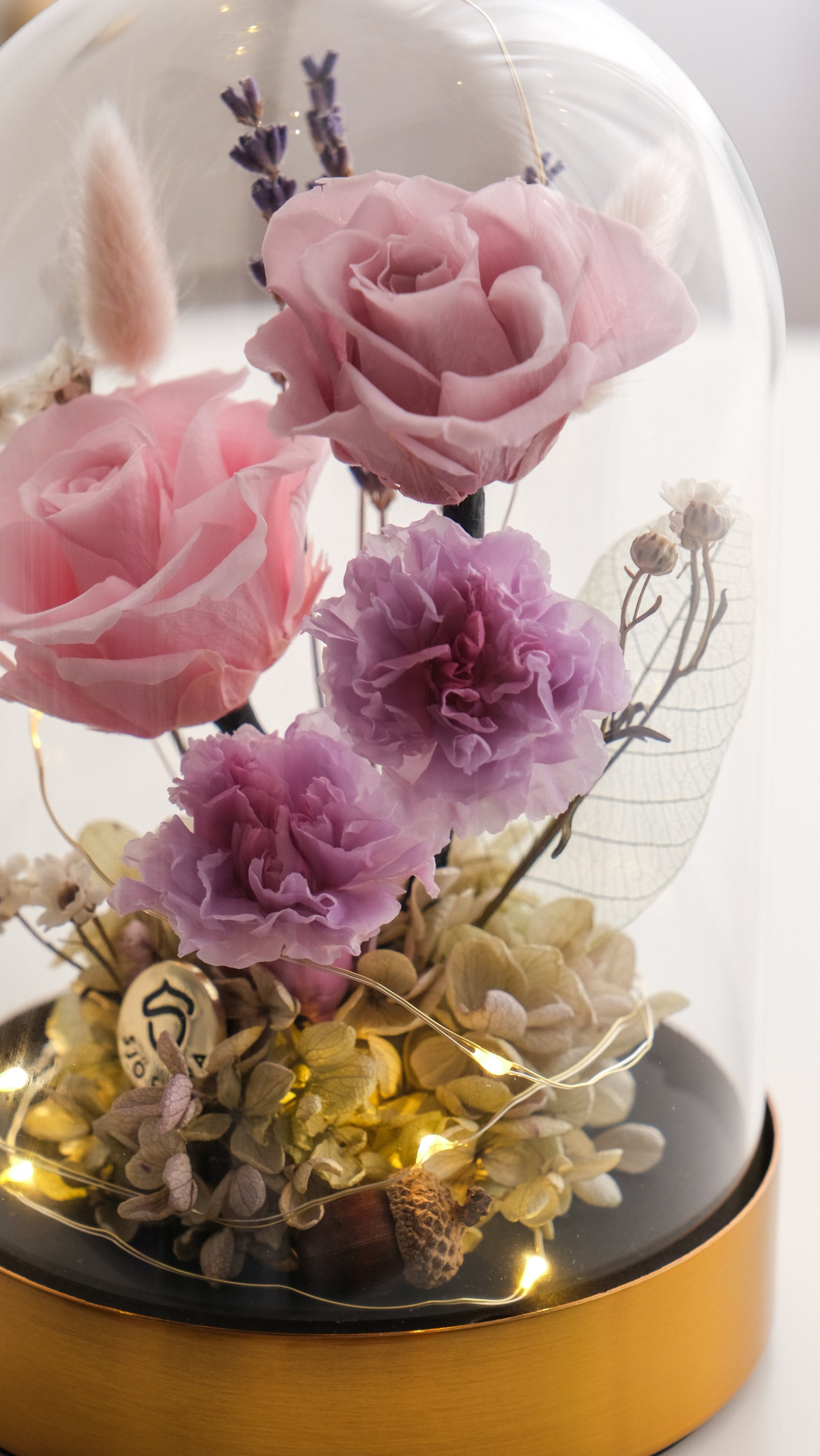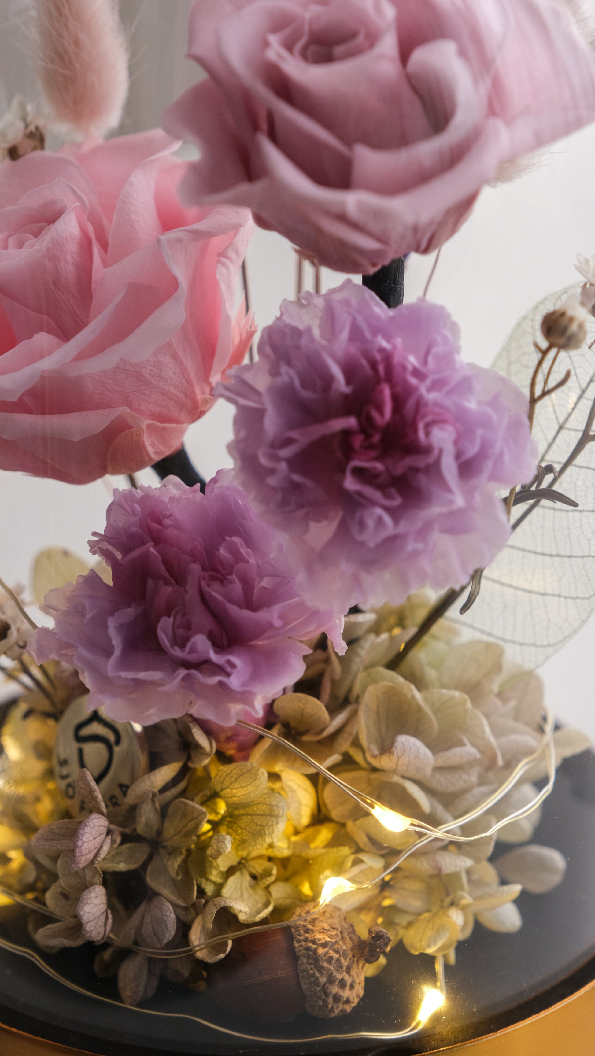 Carnation represents mom's love. The love that protects us and keep us safe. Just like how the bell jar protects the preserved carnation.Now it's your turn to protect them by getting this bell jar as their bedside lamp during the dark night.