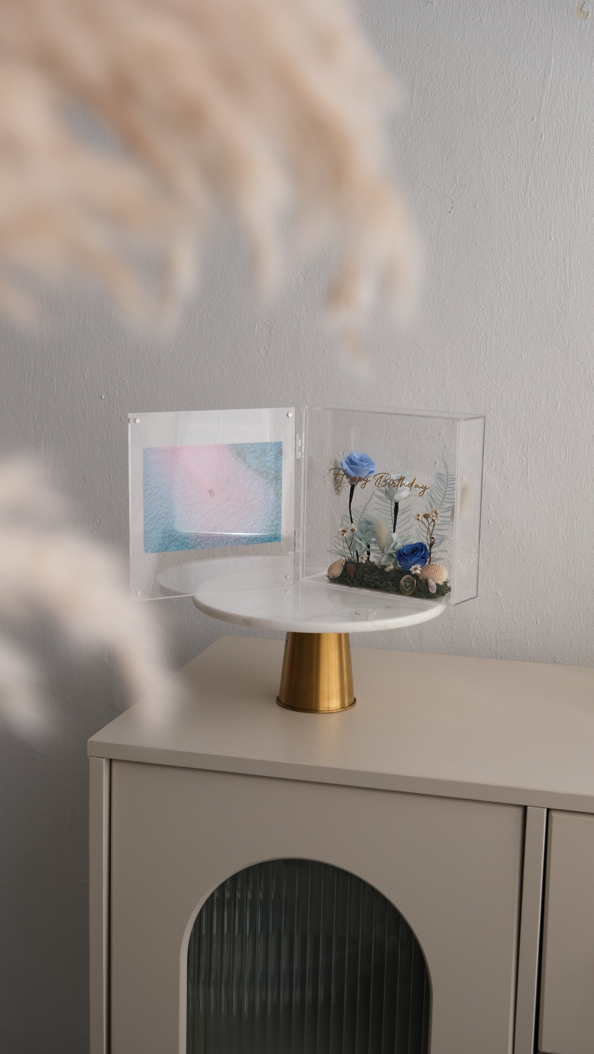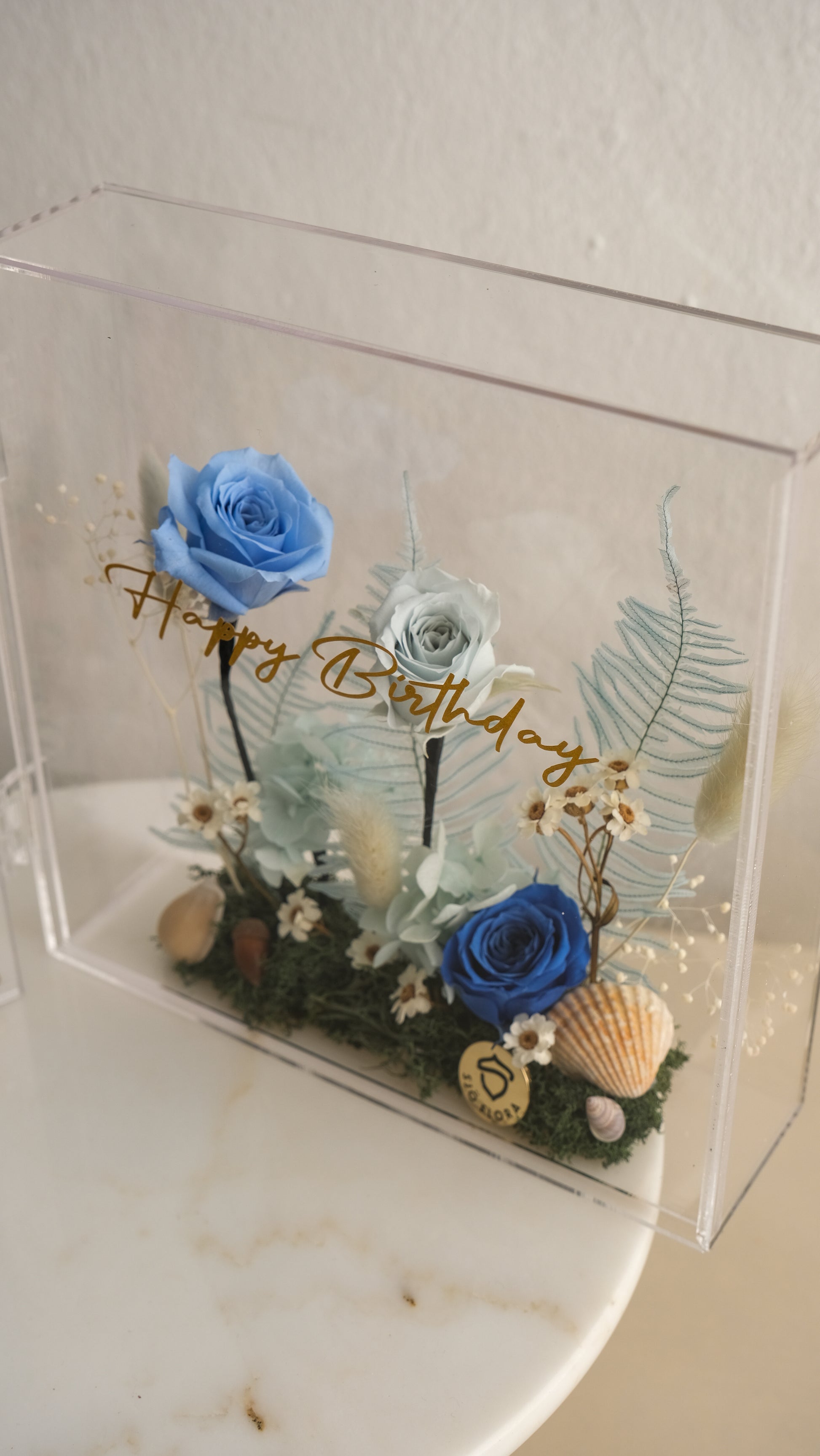 - Materials: Acrylic frame, preserved flowers, moss