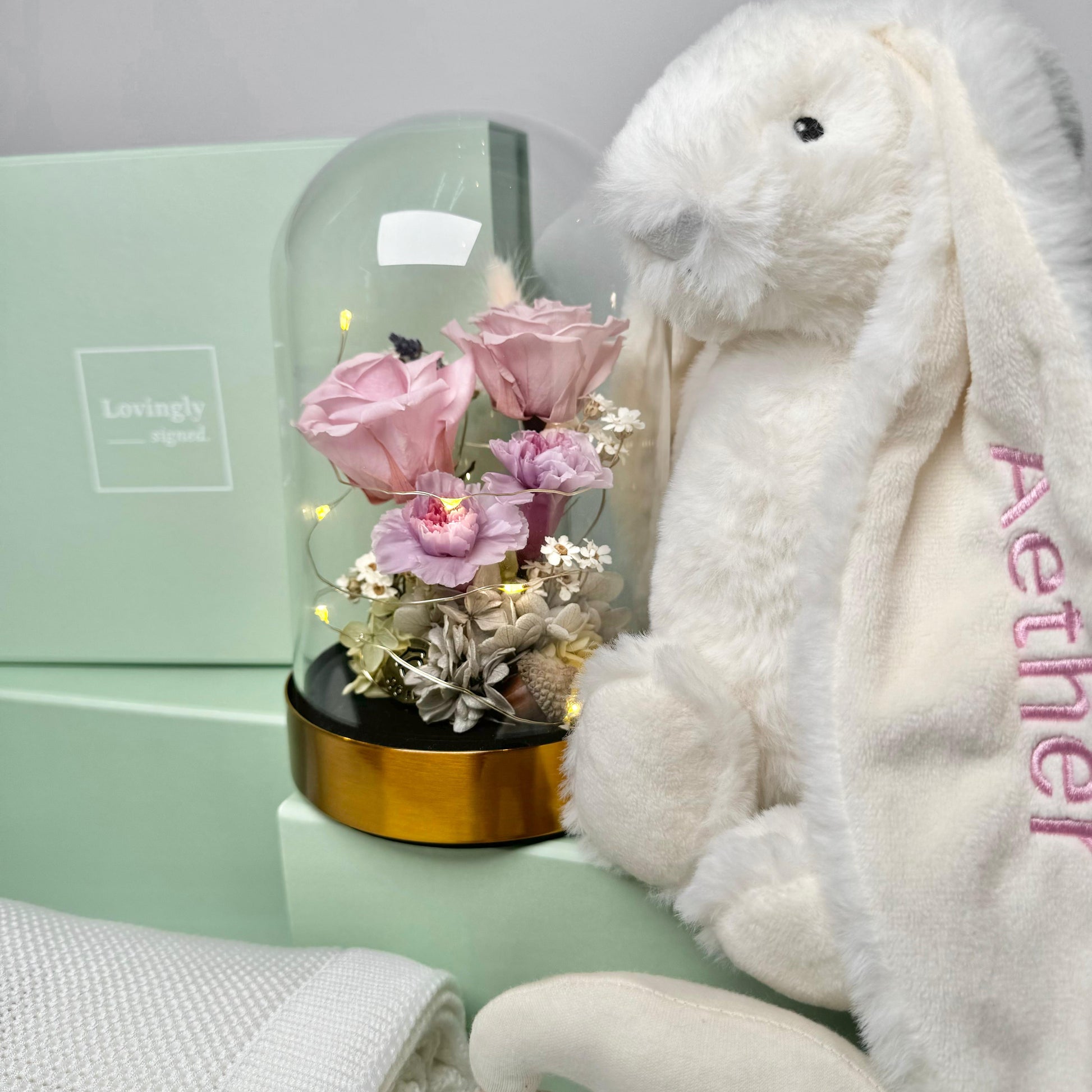 Lovingly Signed’s Twinkle Bunny with a personalized name on its ear – a soft, cuddly companion that will bring joy and comfort to the baby.