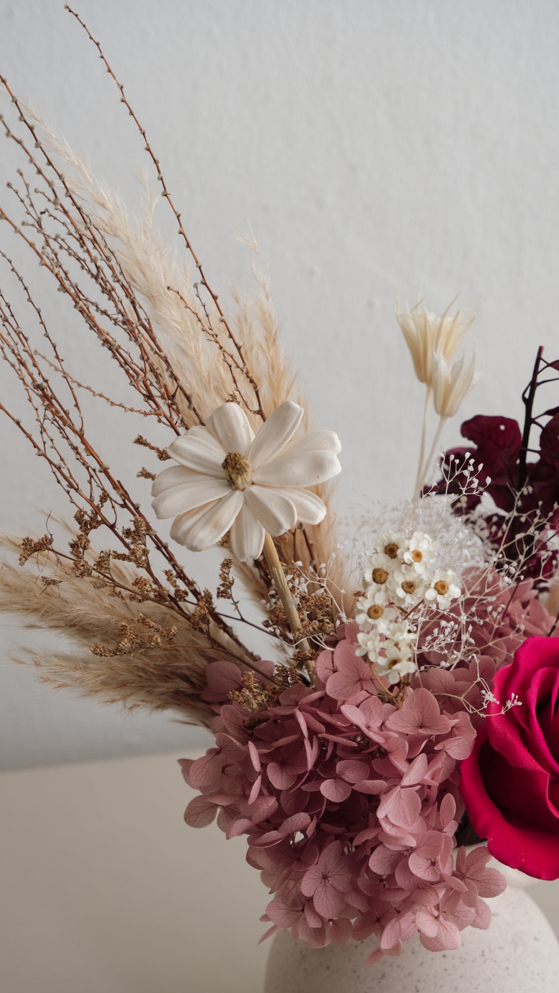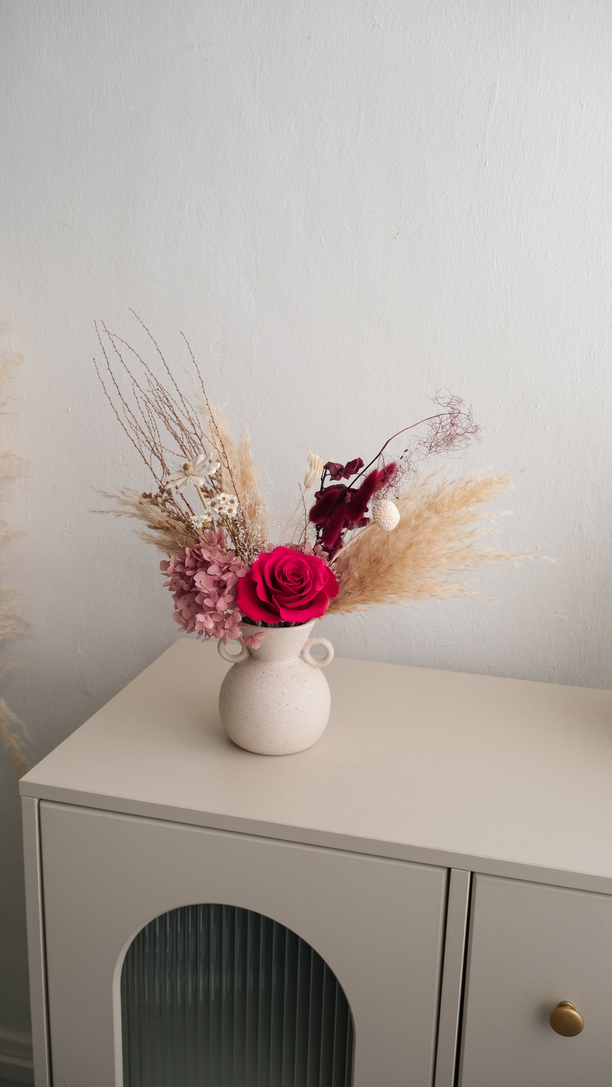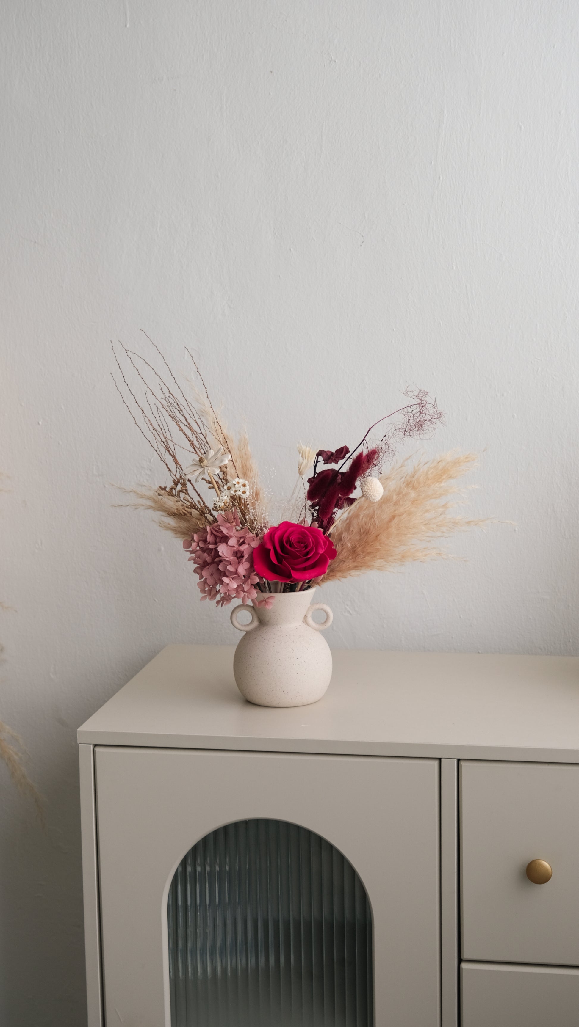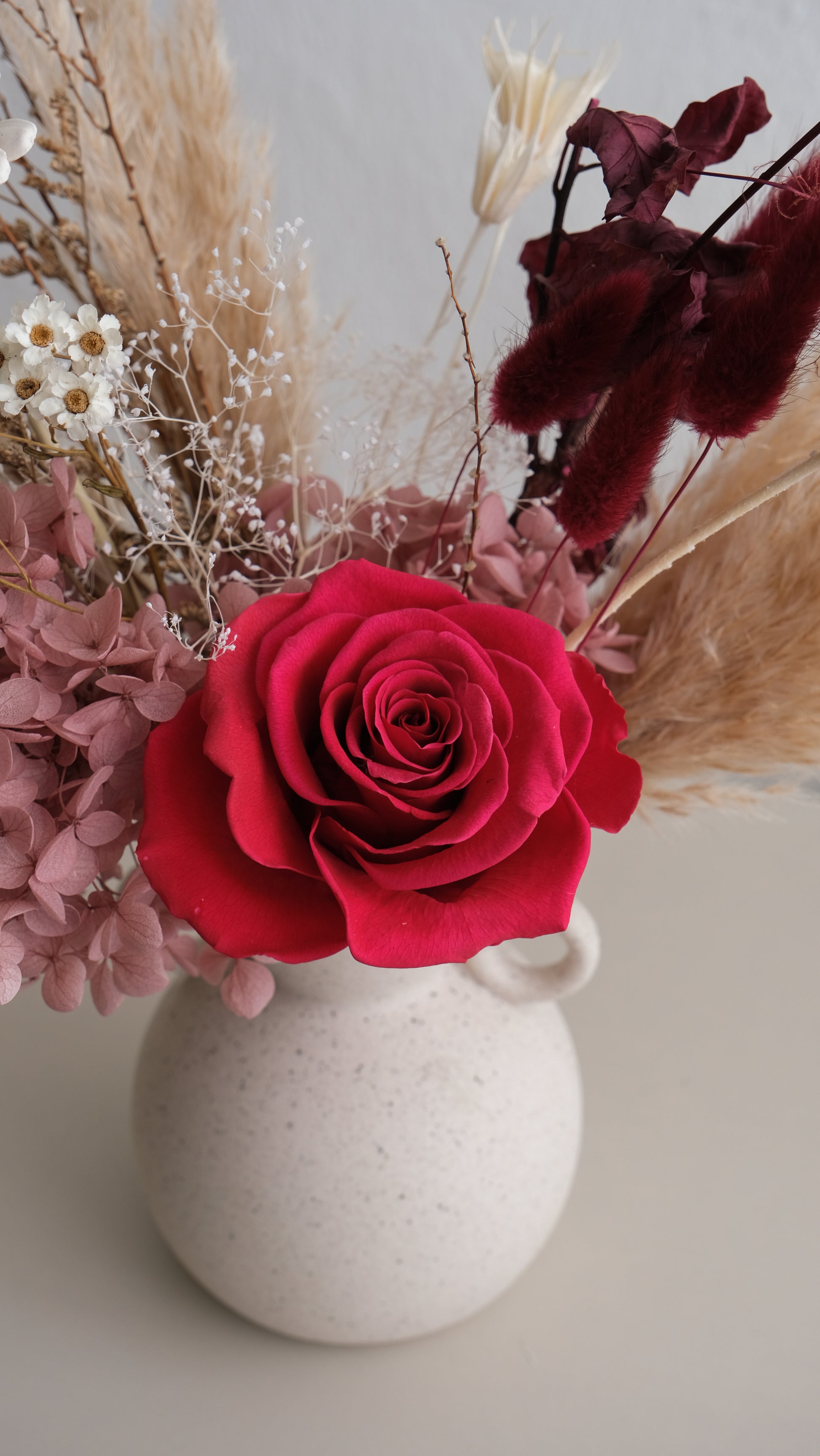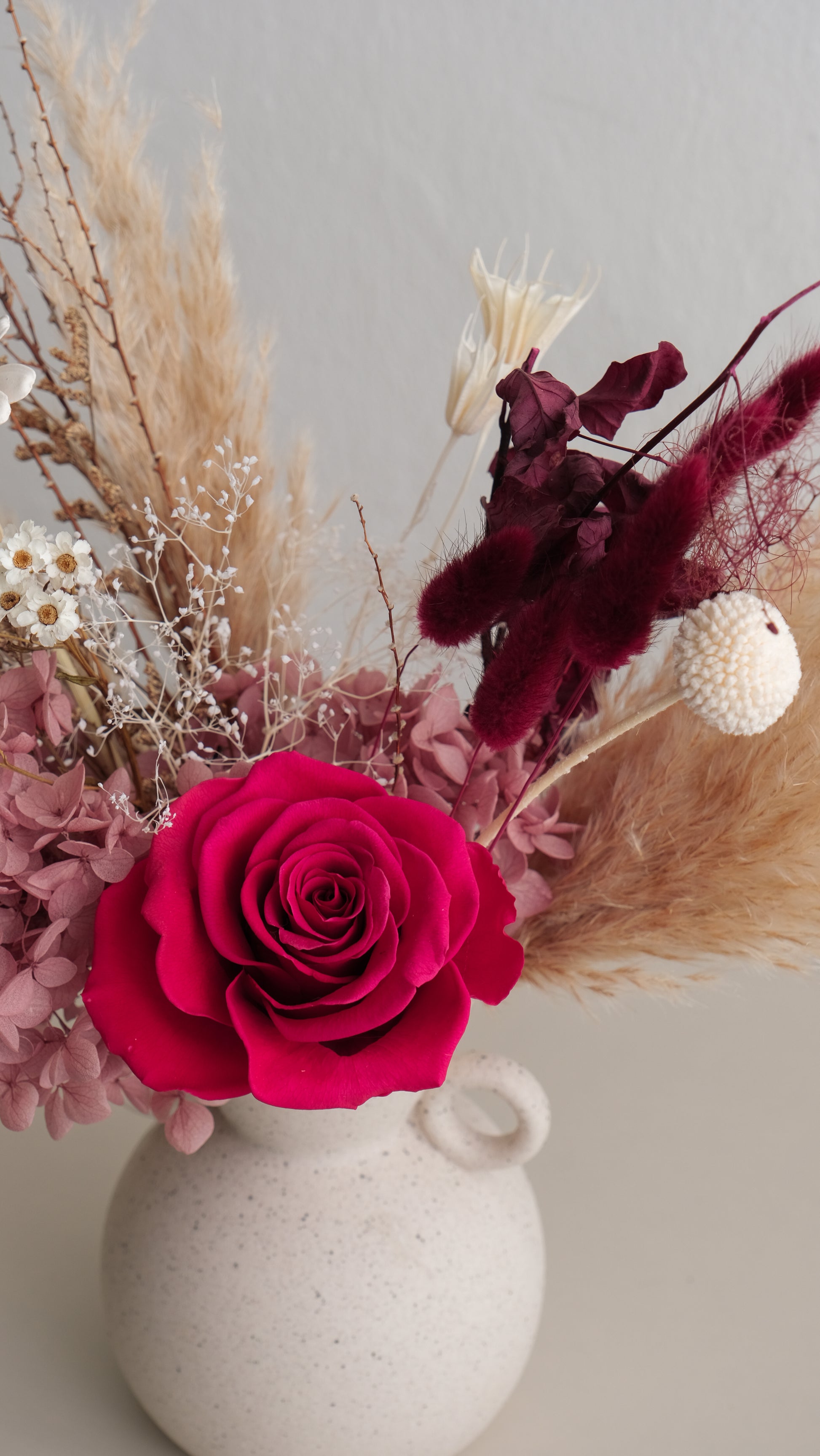 Bring timeless sophistication into your space with this artful preserved flower arrangement. At its heart is a vivid magenta preserved rose, paired with soft purple hydrangeas, airy pampas grass, and delicate dried accents. The arrangement is beautifully set in a Roman-inspired ceramic vase, with its amphora-like silhouette evoking classic antiquity and adding a refined, sculptural charm.