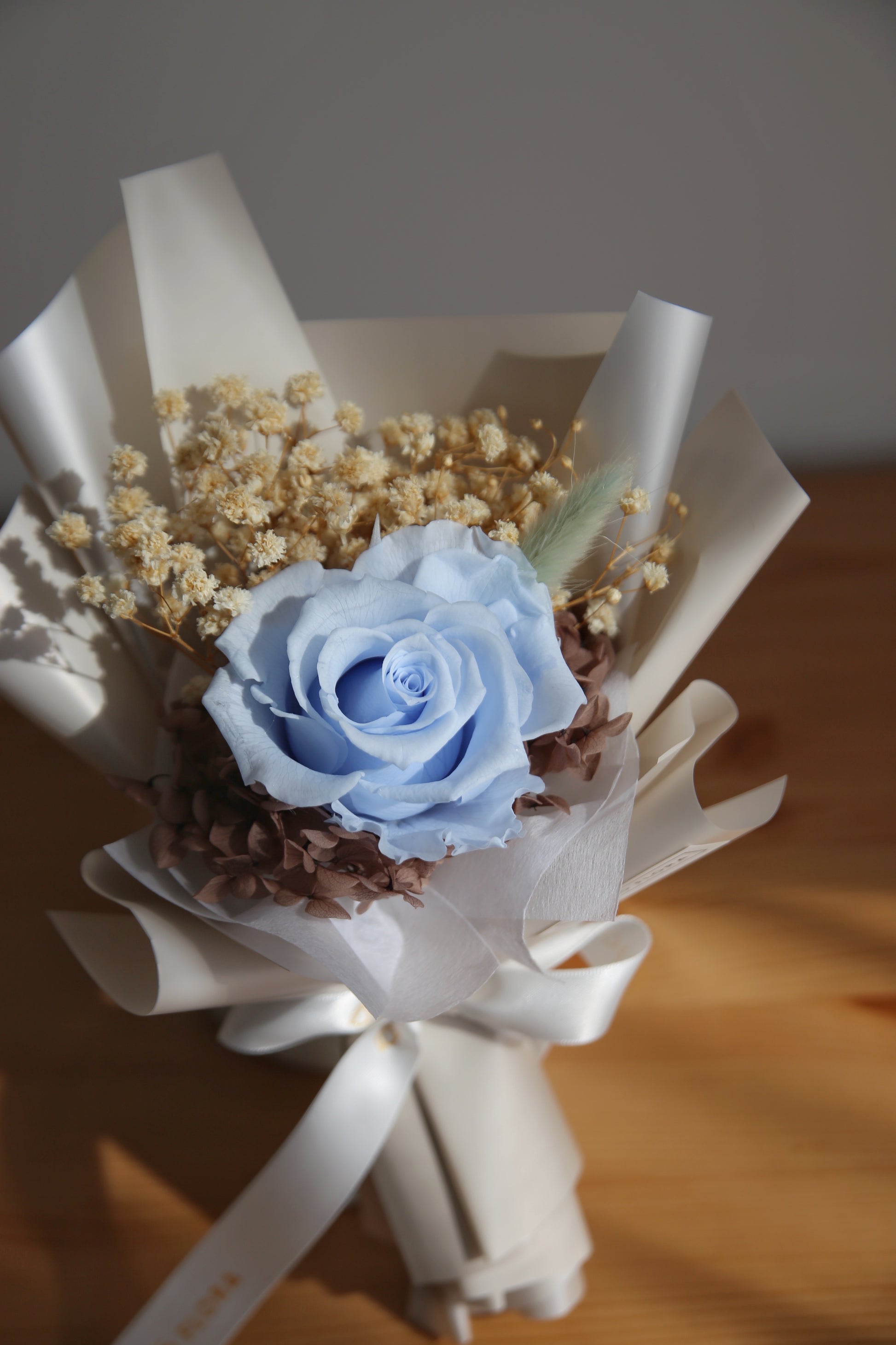 This bouquet is arranged with preserved rose accompanied with preserved and/or dried fillers.